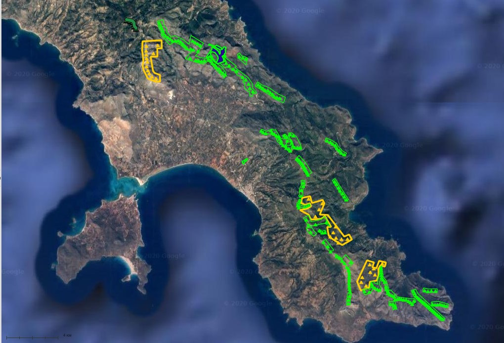 Εκτάσεις με αιολικά στον Μαλέα. Έχει εγκατασταθεί ένα (στην βορειότερη θέση με πράσινο). Τα άλλα διαθέτουν άδεις ή βρίσκονται υπό αδειοδότηση ή υπό μελέτη.