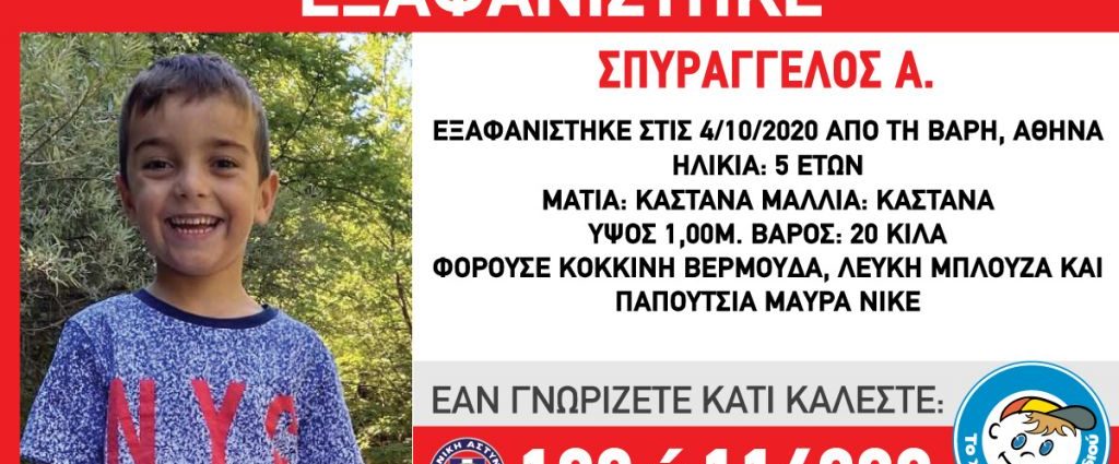 Στις 4/10/2020, απογευματινές ώρες, ο Σπυράγγελος Α., 5 ετών απομακρύνθηκε από τη μητέρα του, η οποία ασκεί την αποκλειστική επιμέλειά του. Ιδιαίτεροι λόγοι καθιστούν απαραίτητη την άμεση εύρεση του, καθώς ο ανήλικος παραμένει μακριά από το άτομο που ασκεί την επιμέλειά του.