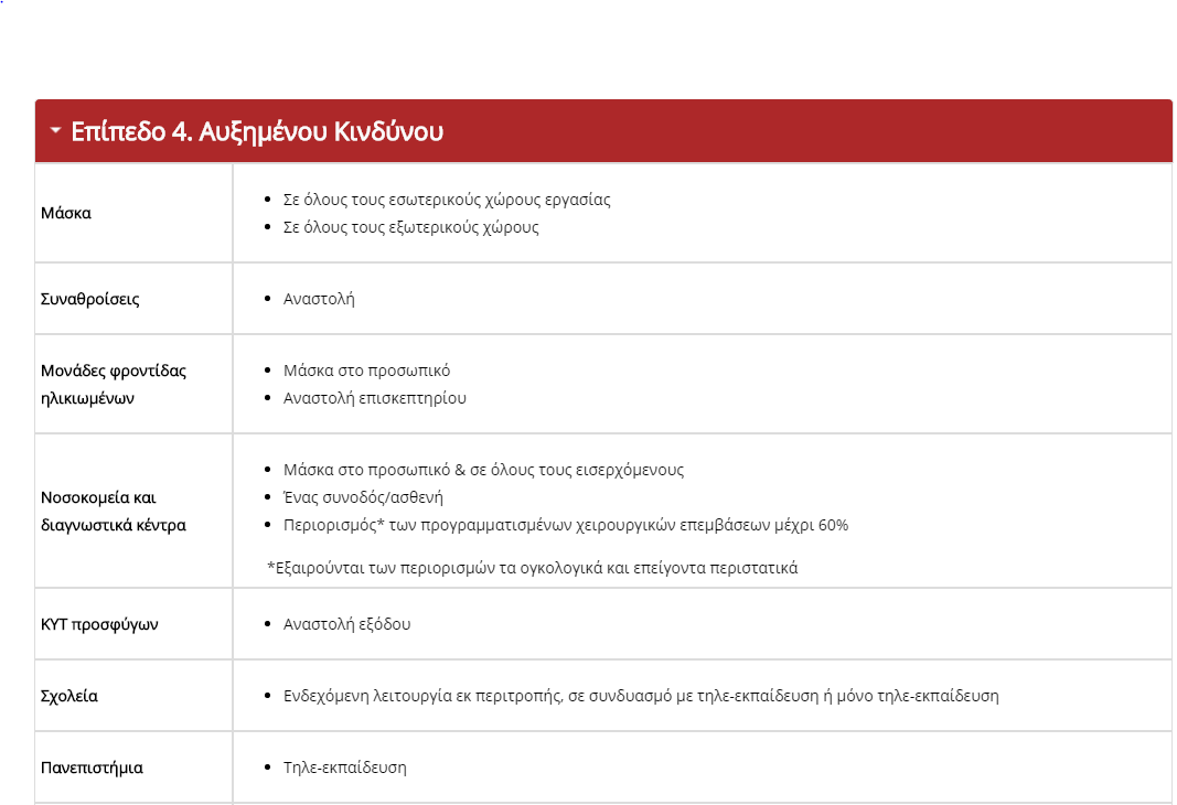 Στην ιστοσελίδα του χάρτη υγειονομικής ασφάλειας, ωστόσο, αναφέρεται απλά για το επίπεδο 4: «Σχολεία – Ενδεχόμενη λειτουργία εκ περιτροπής, σε συνδυασμό με τηλε-εκπαίδευση ή μόνο τηλε-εκπαίδευση».