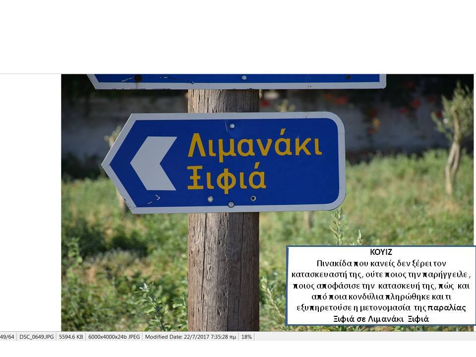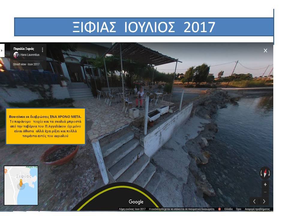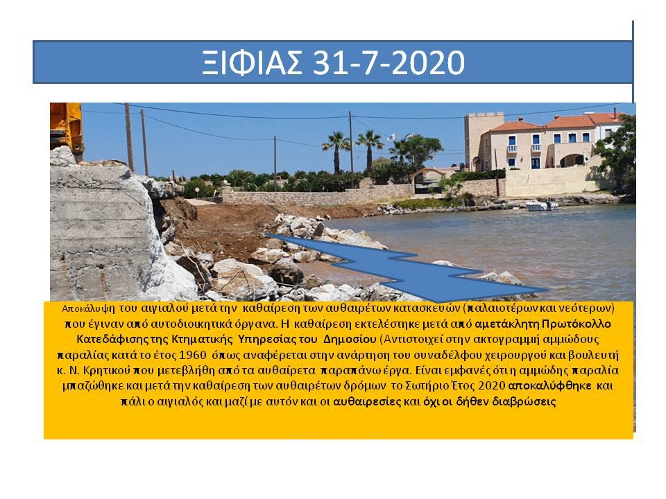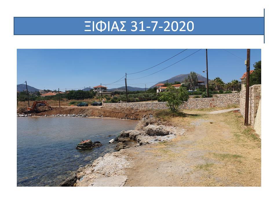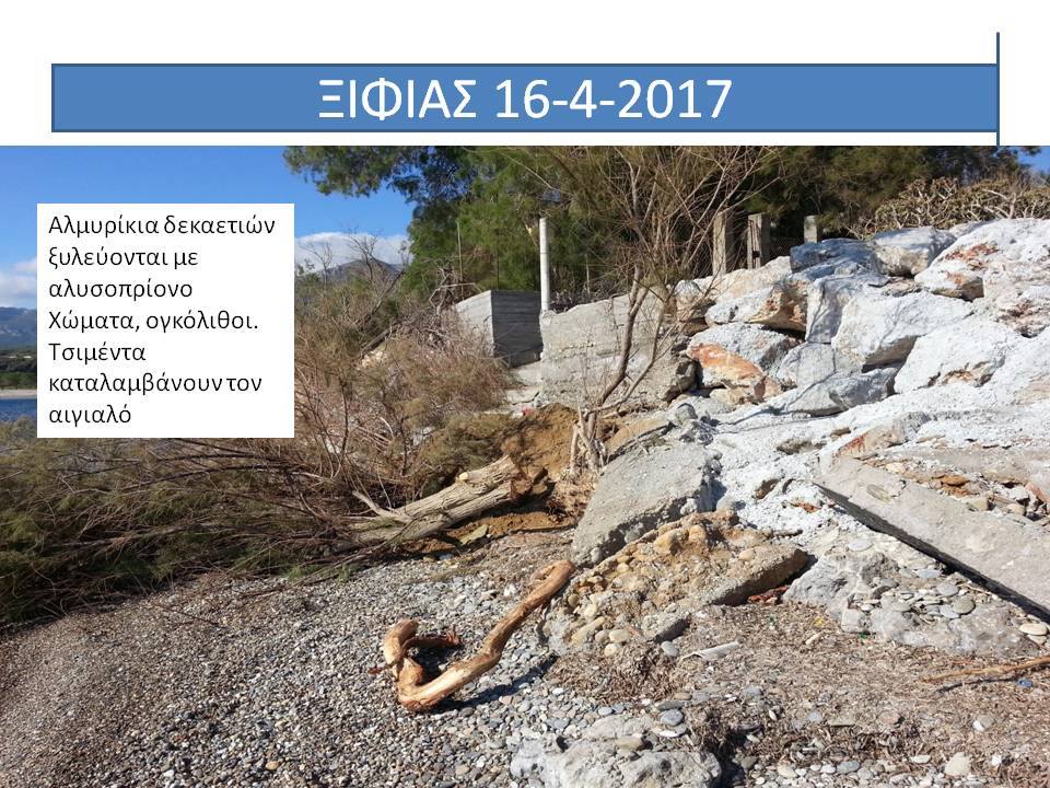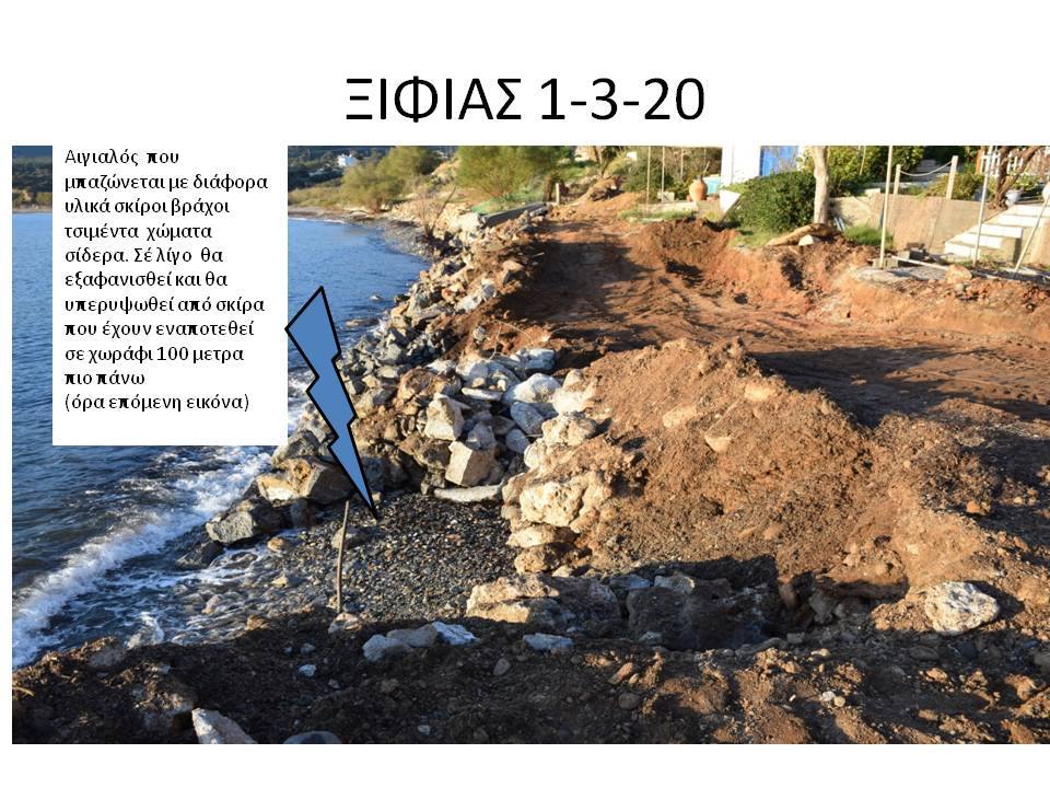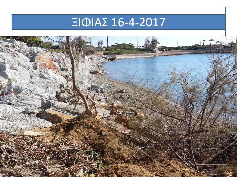 για την δήθεν προστασία του Ξιφιά αποδίδοντας τις αυθαιρεσίες σε δήθεν διάβρωση της ακτής ενώ οι λοιπές όμορες παραλίες παραμένουν απρόσβλητες και ακέραιες από την διάβρωση, παραπλανώντας μέσα μαζικής ενημέρωσης και διαδικτυακούς ιστότοπους και βουλευτές (σ αυτήν την παραλία αναφέρεται ο κ.Κρητικός) που απευθύνουν σχετικές ερωτήσεις στη Βουλή. Δημιουργείται κατά αυτόν τον τρόπο ψευδές κλίμα ,ευνοϊκό όμως για τους υπαιτίους της οικολογικής και περιβαλλοντικής καταστροφής, προκειμένου να χρησιμοποιηθεί από αυτούς στις τυχόν εμπλοκές τους με την Δικαιοσύνη. Παρακαλείστε όπως αξιοποιήσετε το εν λόγω υλικό προκειμένου να σταματήσουν οι ανθρώπινες παρεμβάσεις, να τηρηθεί η υφισταμένη νομοθεσία και να λογοδοτήσουν οι υπεύθυνοι της καταστροφής, συνεργαζόμενοι και ενημερώνοντας με το άρθρο σας τους κ.κ. Βουλευτές Λακωνίας, κ.κ. Περιφερειάρχη και Αντιπεριφερειάρχη Λακωνίας, πολιτευτές της περιοχής καθώς και τα Αρμόδια Όργανα της Πολιτείας τα οποία είναι επιφορτισμένα με τον έλεγχο τού αιγιαλού της παραλίας και των ακτών (ΓΕΝ,ΥΕΝ, Υπουργείο Οικονομικών, Υπουργείο Περιβάλλοντος, Εφορεία Εναλίων Αρχαιοτήτων, Περιφέρεια , Λιμενικό Τμήμα Μονεμβάσιας, προκειμένου να αποδοθεί και πάλι στους Πολίτες ο αιγιαλός και η παραλία Ξιφιά, που έχει καταληφθεί από τους παράκτιους ιδιοκτήτες, και οι οποίοι χρησιμοποίησαν μελέτη ιδιώτη μηχανικού για δήθεν διάβρωση που συντάχθηκε μετά από παραγγελία των ίδιων προκειμένου να ελαφρύνουν τη θέση τους ενώπιον των Δικαστηρίων. Να γνωρίζετε ότι η πλειοψηφία των κατοίκων γνωρίζει πολύ καλά την ανωτέρω περιγραφόμενη αληθή και αδιαμφισβήτητη κατάσταση της περιοχής , καθώς και την περιβαλλοντική και οικολογική καταστροφή που συντελείται από τις συγκεκριμένες παράνομες παρεμβάσεις.