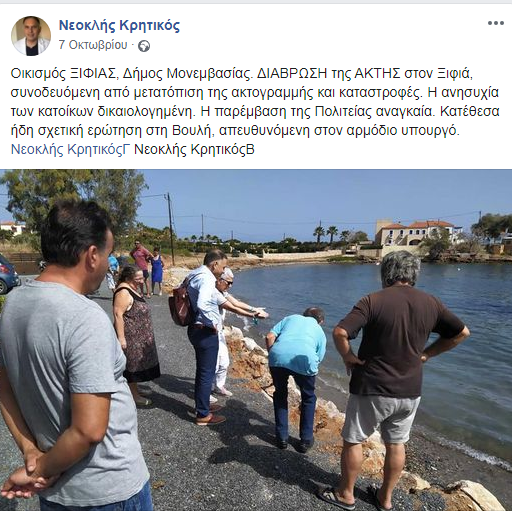 Συγκεκριμένα γράφει ” Οικισμός ΞΙΦΙΑΣ, Δήμος Μονεμβασίας. ΔΙΑΒΡΩΣΗ της ΑΚΤΗΣ στον Ξιφιά, συνοδευόμενη από μετατόπιση της ακτογραμμής και καταστροφές. Η ανησυχία των κατοίκων δικαιολογημένη. Η παρέμβαση της Πολιτείας αναγκαία. Κατέθεσα ήδη σχετική ερώτηση στη Βουλή, απευθυνόμενη στον αρμόδιο υπουργό.”