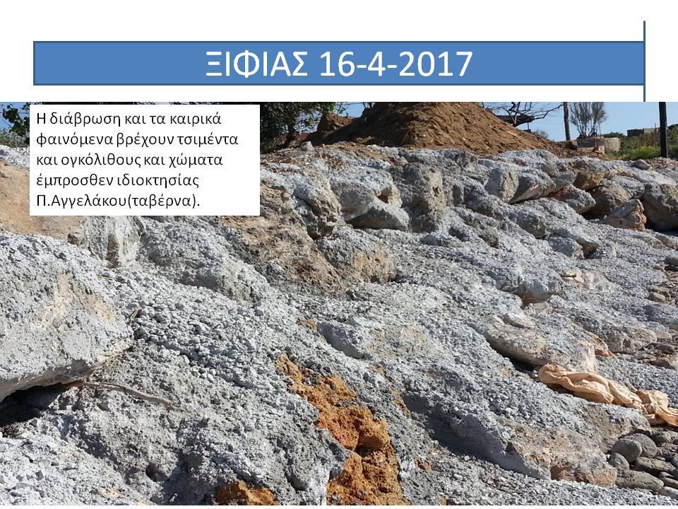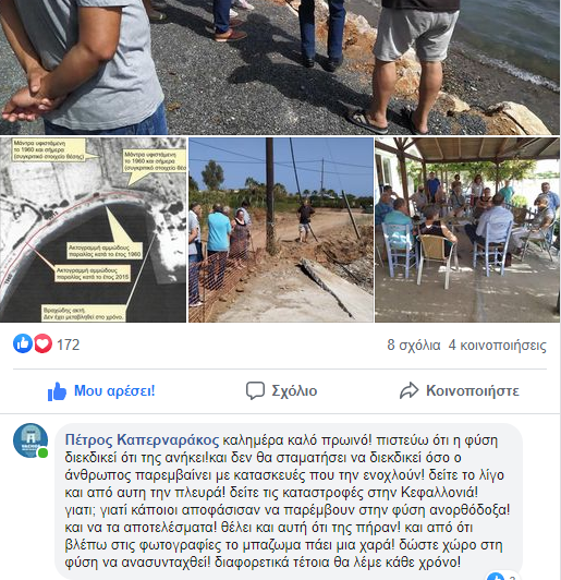 Γράφει συγκεκριμένα ”Πέτρος Καπερναράκος καλημέρα καλό πρωινό! πιστεύω ότι η φύση διεκδικεί ότι της ανήκει!και δεν θα σταματήσει να διεκδικεί όσο ο άνθρωπος παρεμβαίνει με κατασκευές που την ενοχλούν! δείτε το λίγο και από αυτή την πλευρά! δείτε τις καταστροφές στην Κεφαλλονιά! γιατί; γιατί κάποιοι αποφάσισαν να παρέμβουν στην φύση ανορθόδοξα! και να τα αποτελέσματα! θέλει και αυτή ότι της πήραν! και από ότι βλέπω στις φωτογραφίες το μπάζωμα πάει μια χαρά! δώστε χώρο στη φύση να ανασυνταχθεί! διαφορετικά τέτοια θα λέμε κάθε χρόνο!”