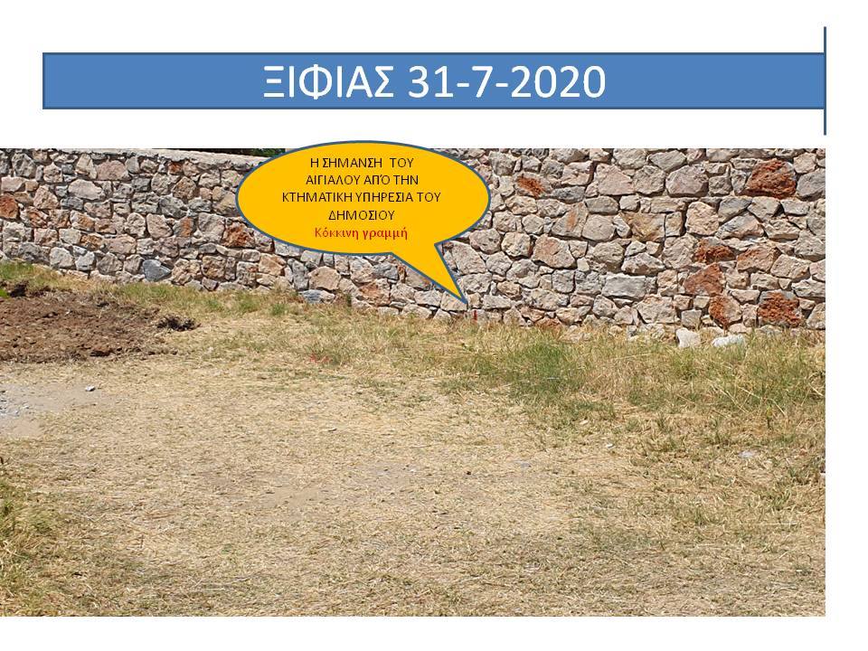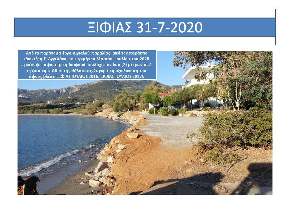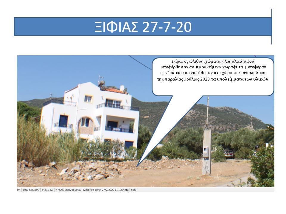 ”Από το υλικό το οποίο σας αποστέλλεται προκύπτει αδιαμφισβήτητα ότι η περιβαλλοντική και οικολογική καταστροφή στην παραλία Ξιφιά , είναι απότοκος των παράνομων παρεμβάσεων ( των παράκτιων ιδιοκτητών; των αυτοδιοικητικών αρχών; των κοντινών ξενοδοχειακών μονάδων και καταλυμάτων; που θέλουν η παραλία Ξιφιά να γίνει ”Λιμανάκι Ξηφιά”ως αναγράφεται στην αναρτημένη πινακίδα, άγνωστο όμως ποιος την ανάρτησε και γιατί, από παραλία Ξηφιά, όπως είναι η κανονική της ονομασία)