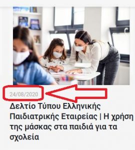 Συγκεκριμένα, η επιτροπή για τον κορονοιό στο απόσπασμα πρακτικού της 107ης συνεδρίασής της σχετικά με την μάσκα στα σχολεία… επικαλείται το δελτίο τύπου του προέδρου της παιδιατρικής εταιρίας –όχι του διοικητικού συμβουλίου της εταιρίας- για να δικαιολογήσει τη χρήση μάσκας στα μικρά παιδιά. Μόνο που αυτό το Δελτίο Τύπου εκδόθηκε τέσσερις ημέρες μετά την συνεδρίαση της επιτροπής!