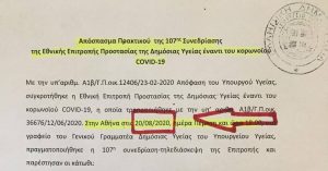 Η Εθνική Επιτροπή Προστασίας της Δημόσιας Υγείας συνεδρίασε στις 20 Αυγούστου. Επί τη βάσει προγενέστερης, άνευ ημερομηνίας, εισήγησης της Επιτροπής Αντιμετώπισης Εκτάκτων Συμβάντων Δημόσιας Υγείας από Λοιμογόνους Παράγονες, η οποία πιθανότατα και αυτή να βασίστηκε σε άλλη εισήγηση, ίσως σε κάποιο χρησμό της Πυθίας.