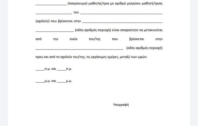 Βεβαίωση κυκλοφορίας για μαθητές-τριες σχολείων!