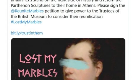 «Lost my marbles»: Νέα καμπάνια για την επιστροφή των γλυπτών του Παρθενώνα 2020-11-09 By: VachosNews On: 9 Νοεμβρίου 2020 In: Πολιτισμός